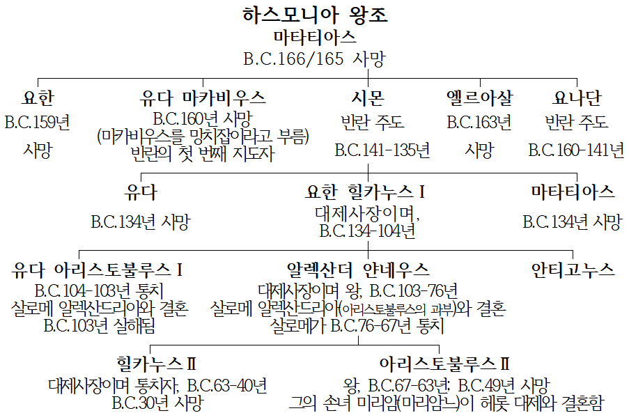 이렇게 하여 하스모니아 왕조가 시작되었으며, 그 후 B.C.63년 로마가 예루살렘을 정복할 때까지 마타티아스의 후손들이 이스라엘을 통치하였다.